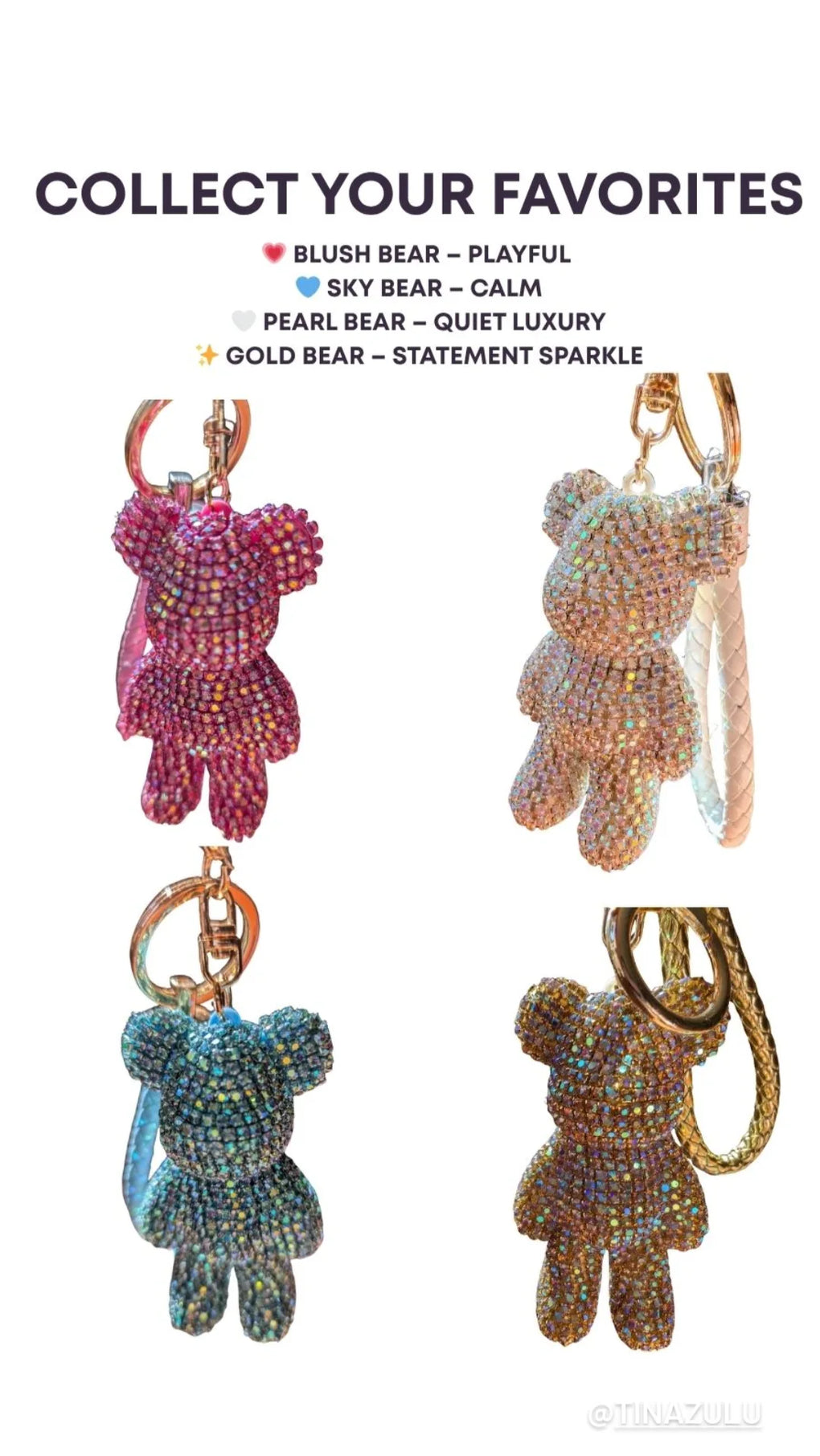 Available in 4 colors—Pink, Blue, White and Gold—each bear carries its own unique mood and character, inviting you to choose the one that reflects you, or collect them all.